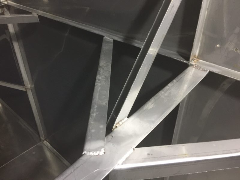 斜拉主要的作用在于分擔(dān)主拉筋的拉力,進一步對水箱板進行穩(wěn)固,切成500mm的長度,連接在水箱與主拉之間。形成龍爪式,常規(guī)尺寸為4cm*1cm厚度一般以靠近頂部的側(cè)板厚度為基準(zhǔn),連接處必須進行滿焊處理。