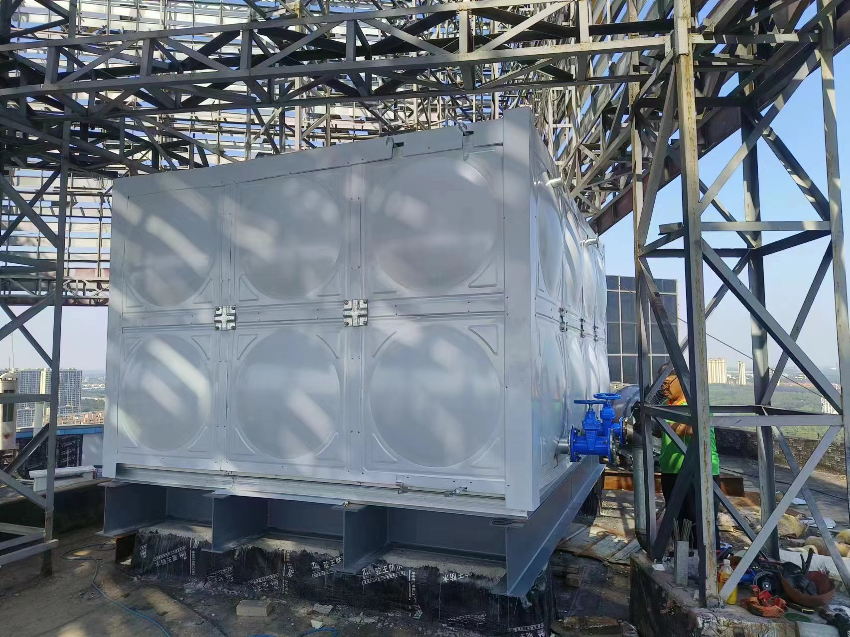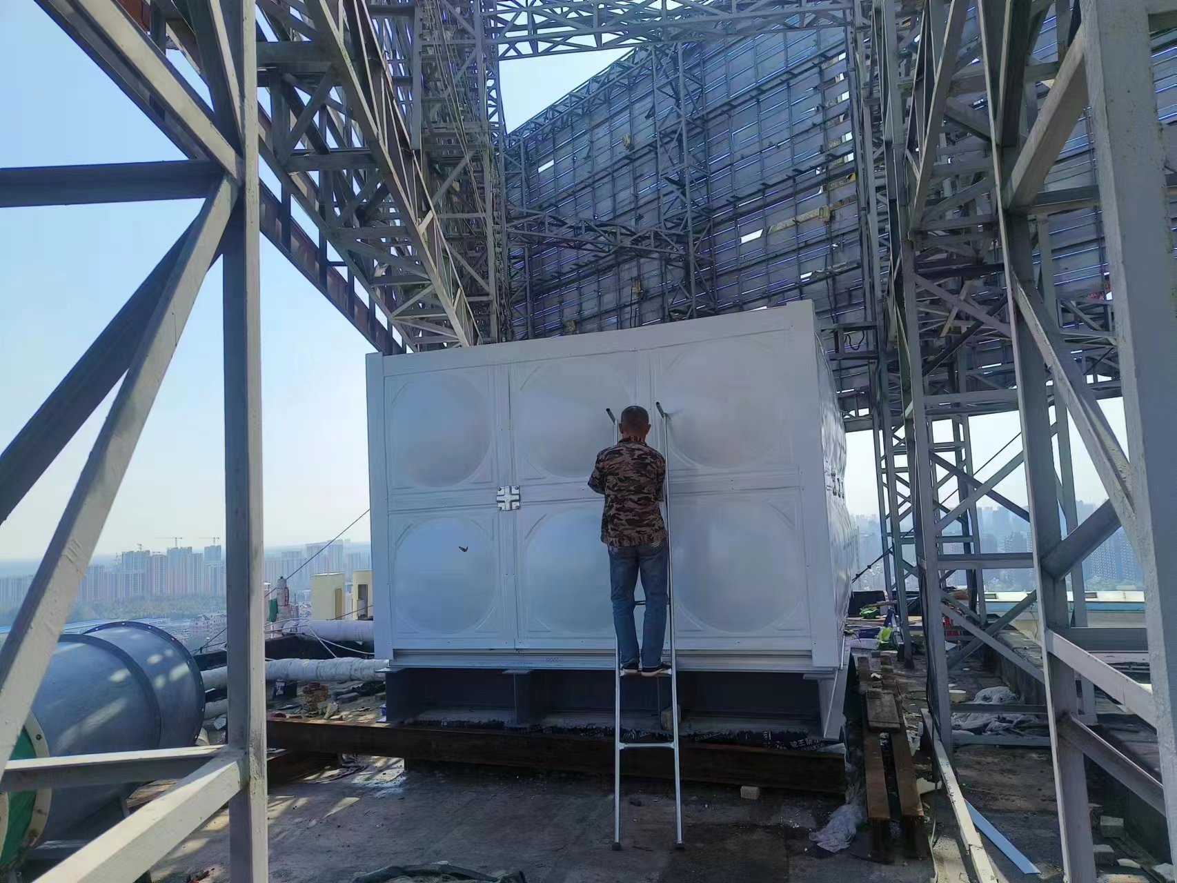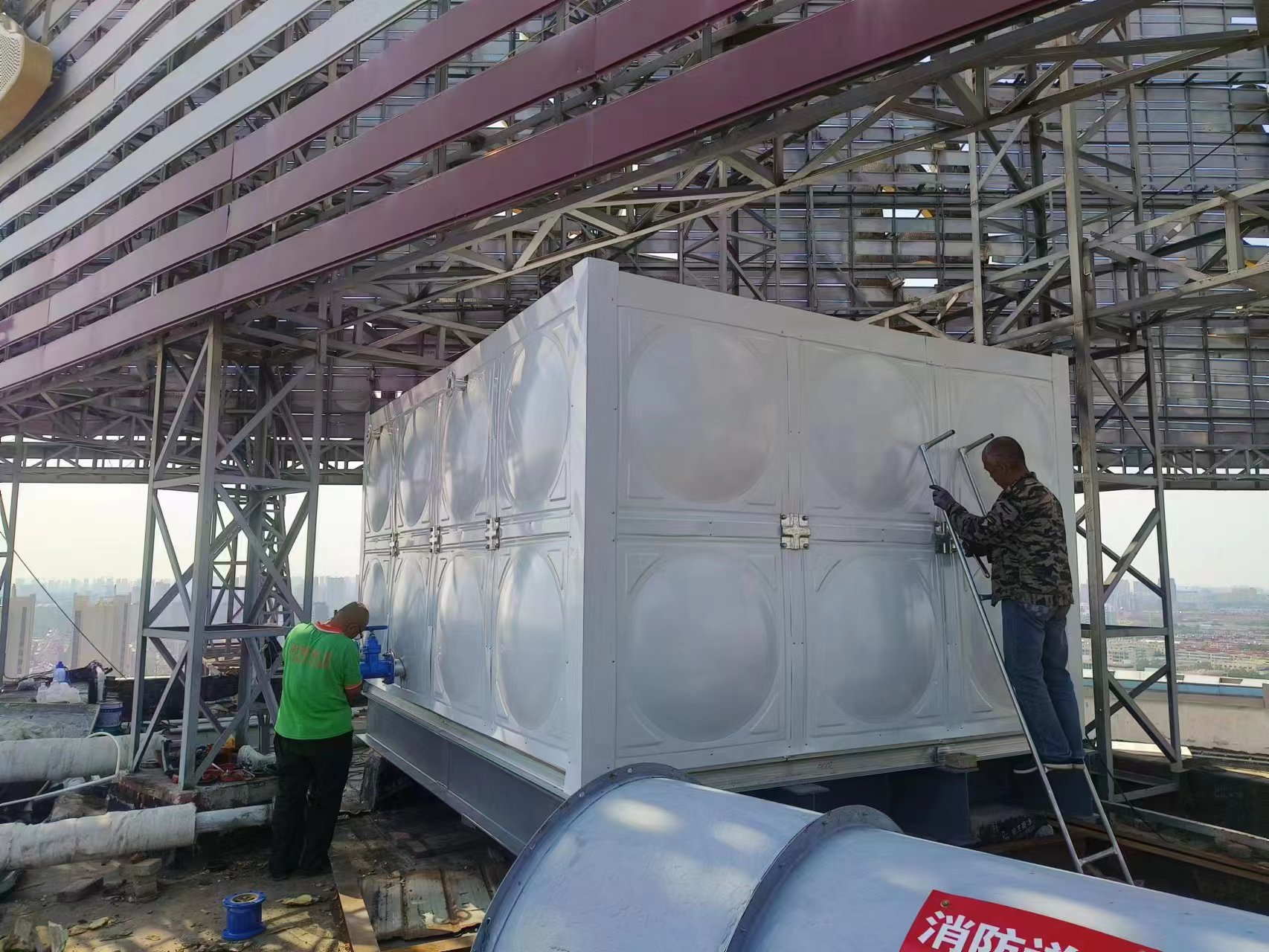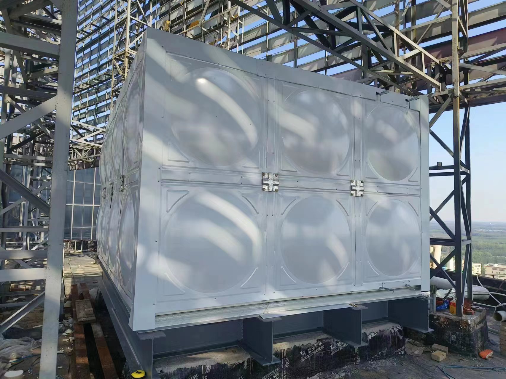 德州德百物流批發(fā)城24立方玻璃鋼聚氨酯彩鋼板保溫水箱已經(jīng)安裝完畢,此次安裝的進度也非???,在規(guī)定的時間內(nèi)完成了安裝和試水,得到了客戶的認可。您的認可就是對我們鼓勵。