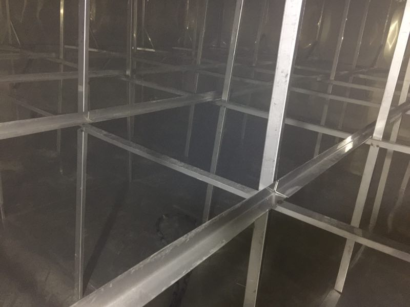 主拉主要作用是防止水箱變形,厚度一般采用靠近底板的側(cè)板厚度為基準(zhǔn),規(guī)格為4cm*4cm。其焊接間距一般為1000mm一條,大型水箱特別是高度超過3米以上的。其間距應(yīng)該為500mm一條,連接處必須進行滿焊處理。